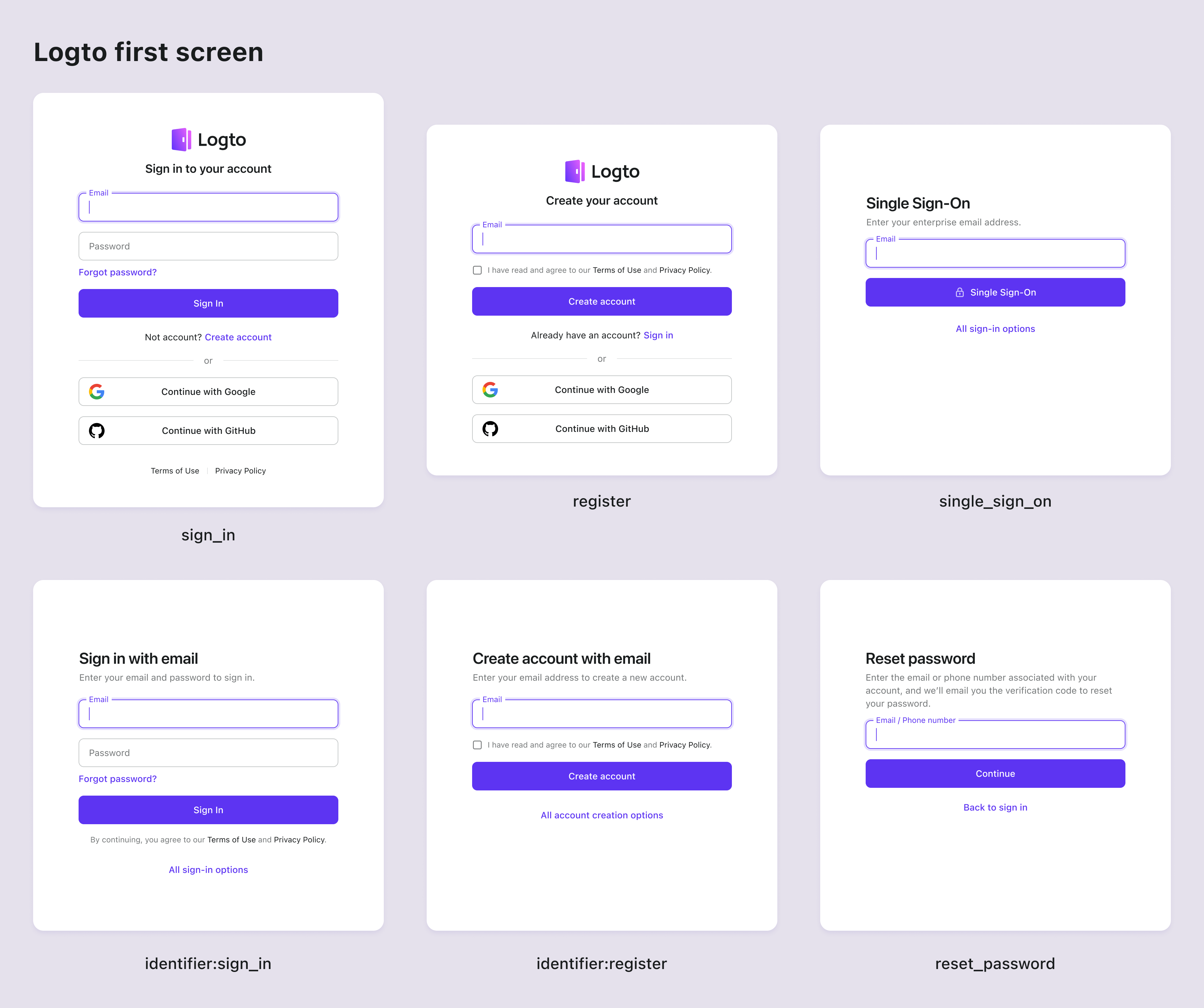 O parâmetro first_screen é o parâmetro chave que determina a primeira tela que os usuários verão ao serem redirecionados para a página de login do Logto. Por padrão, o formulário universal de login será exibido. Use este parâmetro para personalizar a primeira tela de acordo com os requisitos do seu aplicativo. Os valores suportados são: